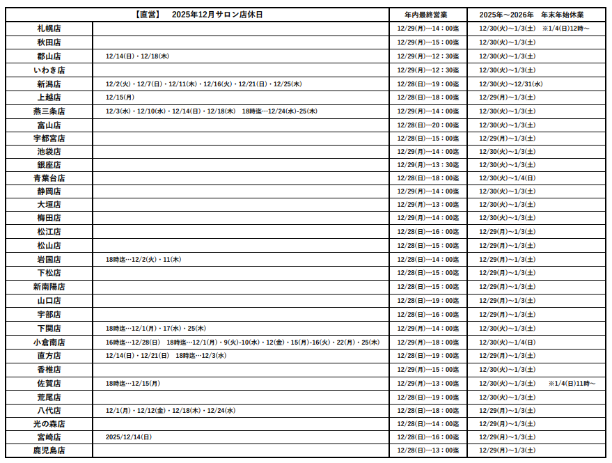 12月・年始店休日のお知らせ