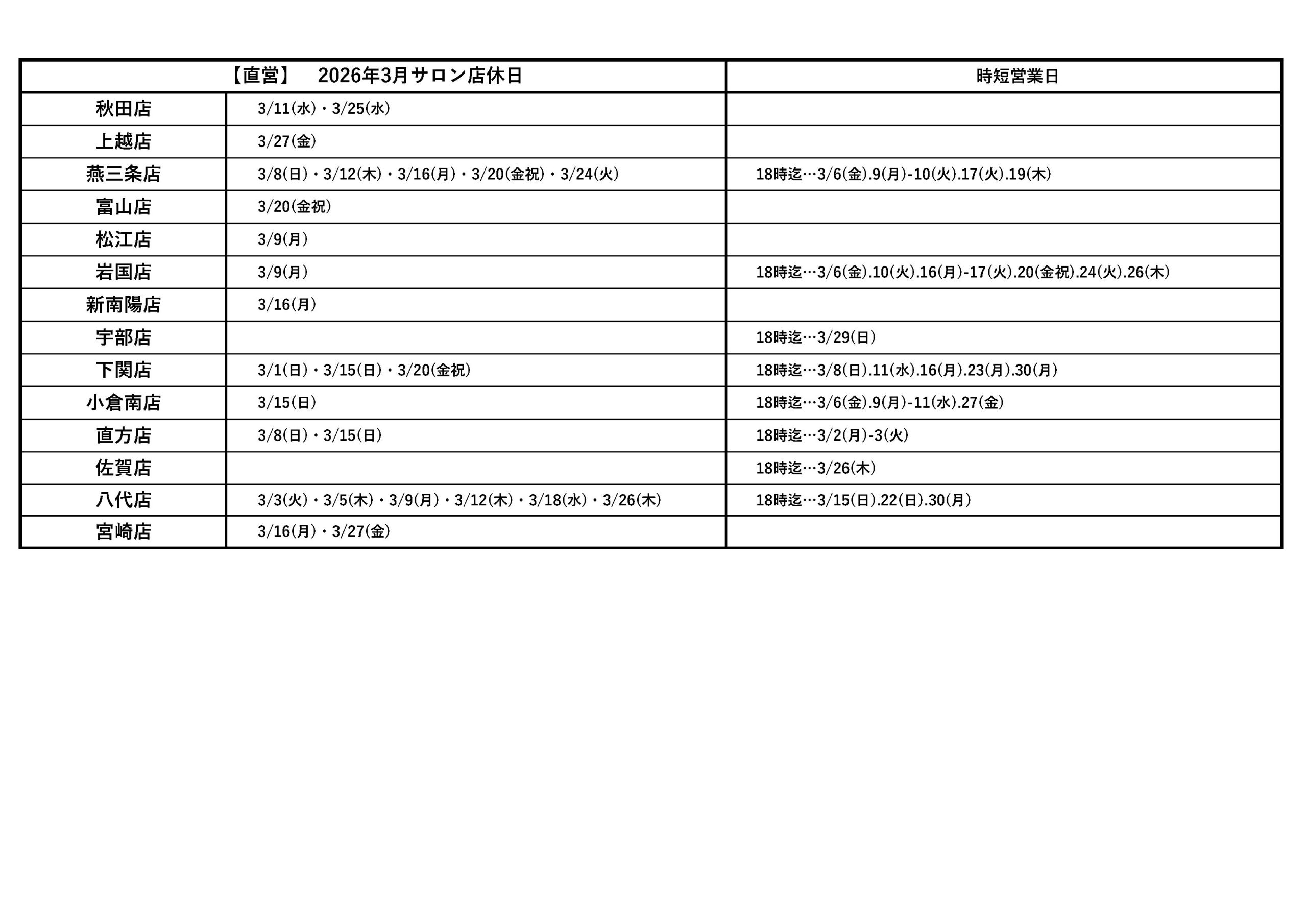 3月店休日のお知らせ