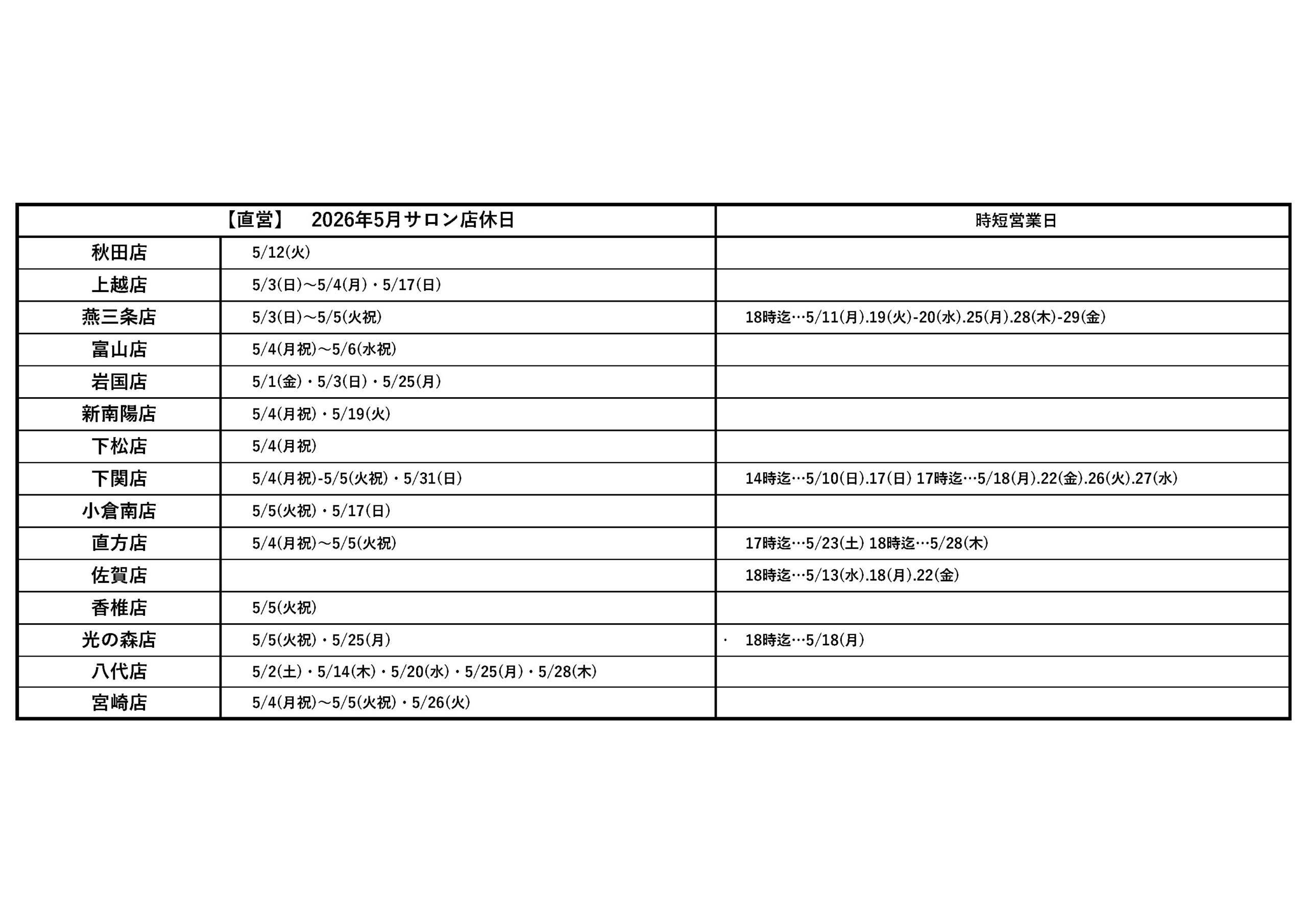 5月店休日のお知らせ